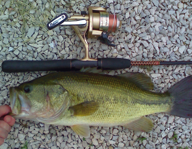 Only managed one bass, but it was the biggest one I saw. Kind of annoying when you can see them sitting there and they don't even acknowledge the 10 different baits I throw at them. Had to use a live crawler to get a hit. 16.5" |