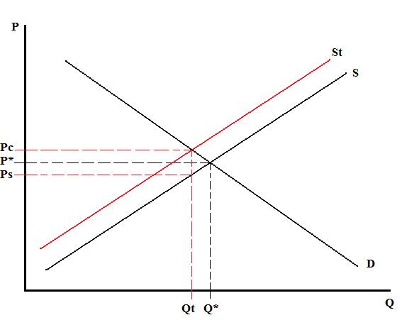 "Maybe it wouldn't react this quickly, but wouldn't cheaper gas just mean higher demand which would put the price right back where it was?" Not necessarily. Since the tax is "on" the sellers (they send the money to the gov't), you could look at the tax as affecting the supply curve instead of the demand curve. After looking through an old textbook to refresh my econ knowledge, I think I can explain this. Hopefully it will make some sense. P* and Q* = Equilibrium price and quantity in the market with no tax. The tax will cause the supply curve (S) to move to the left by the amount of the tax, resulting in a new supply curve (St). This will raise the price consumers pay for a gallon from P* to Pc (as well as reducing the amount sold to Qt). Sellers then pay the tax from this price and thus only receive the price of Ps. Note that Pc - Ps = amount of the tax, and that the burden of the tax is split between the buyers and the sellers as buyers end up paying a higher price than they normally would (the difference between Pc and P*), while sellers end up receiving less than they normally would (the difference between P* and Ps). So, a repeal of the tax would move things back to the original equilibrium and would mean that consumers would pay less to the sellers and sellers would pay less to the government, so everybody is happy (except the environmentalists). You could also look at this as a change in demand instead of supply, which is how it is looked at when the tax is on the buyers (you send the government money each time you fill up). In that case, the demand curve would move left by the amount of the tax and the supply curve would stay the same (their intersection would be at the point (Qt, Ps)). However, this would change the price and quantity in the exact same way as before, only this time sellers would sell at Ps, and the tax would cause the real cost on the buyer to be Pc. Now, some details will change depending on what the curves actually look like. In this case, I would guess that the demand curve for gas would be more inelastic (vertical), and this would cause the burden of the tax to fall more on buyers than sellers, but the overall story would be the same. **Note** - My standard caveat applies here. This is just a simple model of what happens. There are probably many other factors in the real life that may completely change the whole picture. Also, there is the always the strong possibility that I have misinterpreted the economic concepts and am totally wrong in my explanations. |