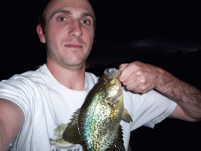 Well, fishing on Wissota was not too good. No muskie sightings, a 24" northern, couple walleye, crappie, and rock bass. I did see a huge carp get a clear foot out of the water. 12" crappie, self portrait because my dad was busy being snagged |