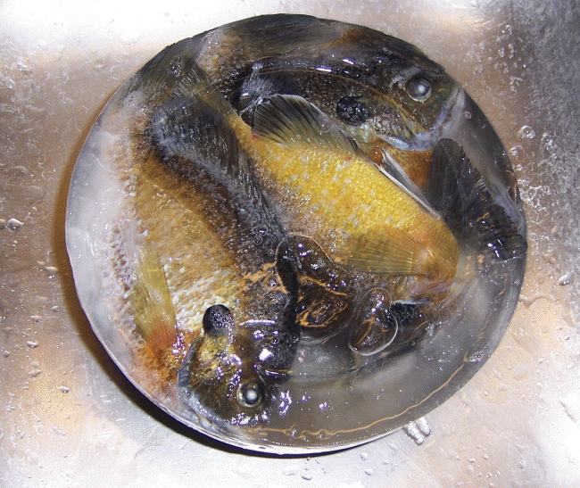 With nothing much better to do while on call, I tried fishing for keeps in the local water. Final tally of 10 bluegills and 2 crappie. I didn't measure any of them but they weren't huge except for one pretty nice bluegill. Threw back a lot of little bluegills and there just doesn't seem to be any eater size perch in there but threw some small ones back. Also I had on another 16"ish bass but instead of going for the instant landing like a crazed tournament fisherman I played him out a little and he spit the hook. I fished 2 shifts and instead of cleaning fish twice I froze the first batch: |