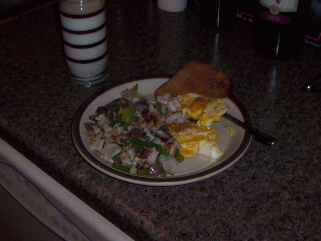 Had my basic fish dinner last night, little oil (bacon grease works too) plus green peppers and some onion fried up on the stove. I addded in some eggs and toast for good measure. Edit: Working on a baked dish that I just made up. Put fillets in casserole dish, splash on some italian dressing, toss in some green peppers (90% of my recipes for anything include green peppers), then add a layer of crunched up tortilla chips with cheese on top. Edit: Well, it was a little scary looking and I over-cooked it just a tad, but it was actually quite tasty. |