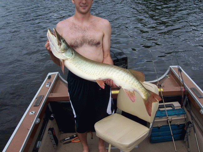 Winner!!!!!!!!!!!!!!!!!!!!!!!!!!!!!!!!!!!!!!!!!!!!!!!!!!!!!!!!!!!!!!!!!!!! 43", Fox Lake, Friday, July 18, 2008, sometime between 12 and 12:30, single small silver colorado blade on black spinnerbait with a little yellow mixed in the skirt (much more bass bait than muskie), and she launched clear of the water once at which point I believe my heart stopped beating for a few seconds. |