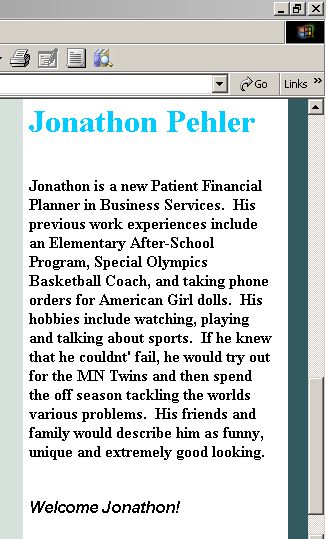 I just found this while cleaning out my email. If I remember Jon had to answer a questionnaire when he started and they turned in into this paragraph for the intracompany website. Tag it! Hilarious, Financial Planner, Welcome Jonathon!, Blue, white, teal, words |